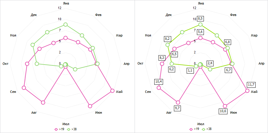 Пример отображения лепестковой диаграммы (обычной и с отображением подписей данных):