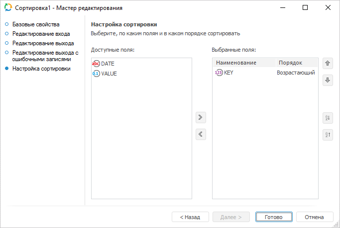 В списке «Доступные поля» содержатся все входные поля объекта-преобразователя, по которым доступна сортировка. В списке «Выбранные поля» содержатся поля, по которым будет выполняться сортировка.