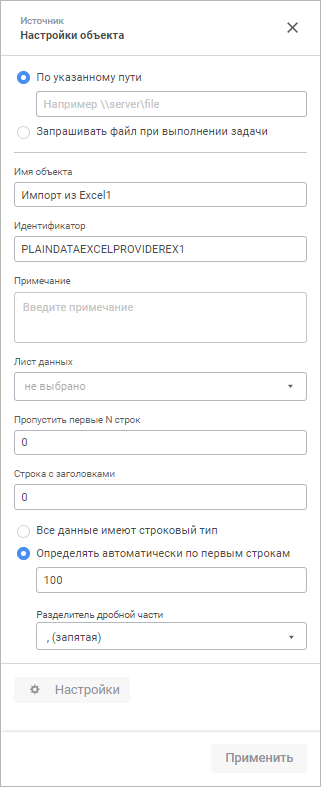 По указанному пути. По умолчанию переключатель включен, активно поле ввода пути к файлу. После ввода пути файл будет импортирован и появится возможность производить дальнейшие настройки с использованием структуры файла. При выполнении задачи ETL поиск файла будет осуществляться также по указанному пути;