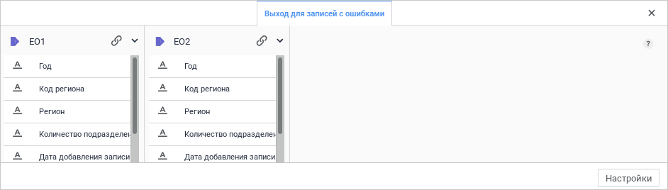 Примечание. Вкладка «Выход для записей с ошибками» показана на примере преобразователя «Объединение». Вид панели и количество доступных выходов зависит от типа преобразователя.