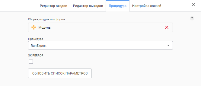 Список входов и выходов может формироваться только на основании выходов источника, к которому подключается текущий объект. При этом фактические данные в выполняемую процедуру/функцию передаваться не будут. Они один к одному будут переданы со входа на выход. Задание входов/выходов используется для включения объекта «Процедура» в какую-либо цепочку выполнения.