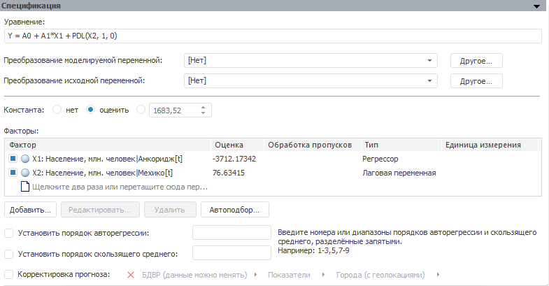 Для задания дополнительного преобразования моделируемой/исходной переменной перед расчетом модели используйте раскрывающий список «Преобразование моделируемой/исходной переменной». По умолчанию преобразование входной переменной совпадает с преобразованием моделируемой переменной.