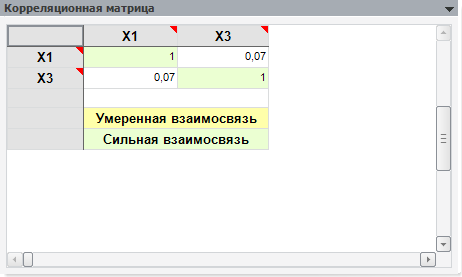 Желтый. Умеренная взаимосвязь. Значение коэффициента корреляции находится в диапазоне по абсолютному значению от 0,5 до 0,75;