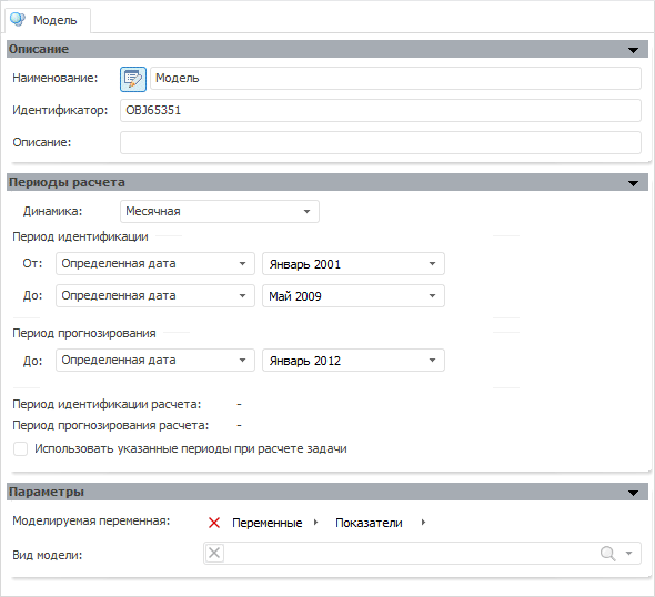 На панели «Периоды расчета» задайте календарные параметры расчета модели. Для всех создаваемых моделей укажите одни и те же календарные параметры: динамика - месячная; период идентификации - с января 2001г. по май 2009г.; период прогнозирования - по январь 2012г.
