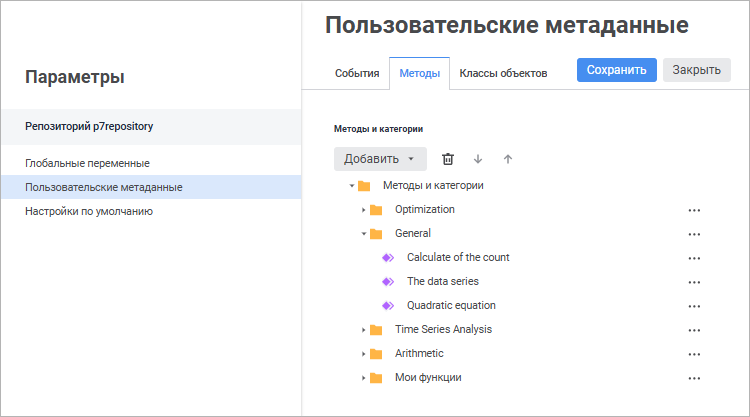 На вкладке «Методы» содержатся пользовательские функции, разделённые по папкам. Папки - это категории, предназначенные для упорядочения и группировки функций.
