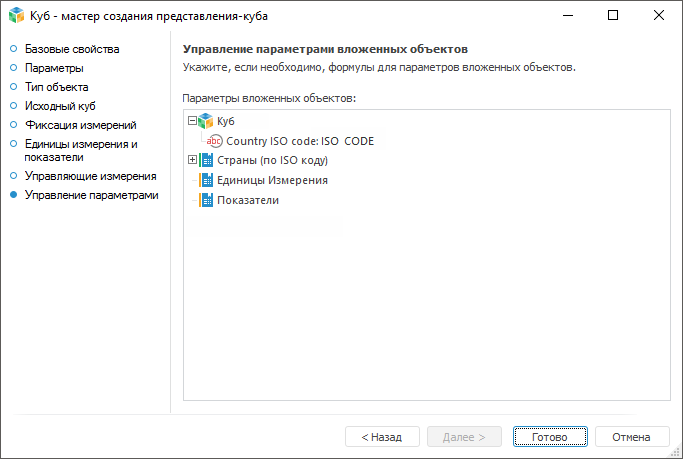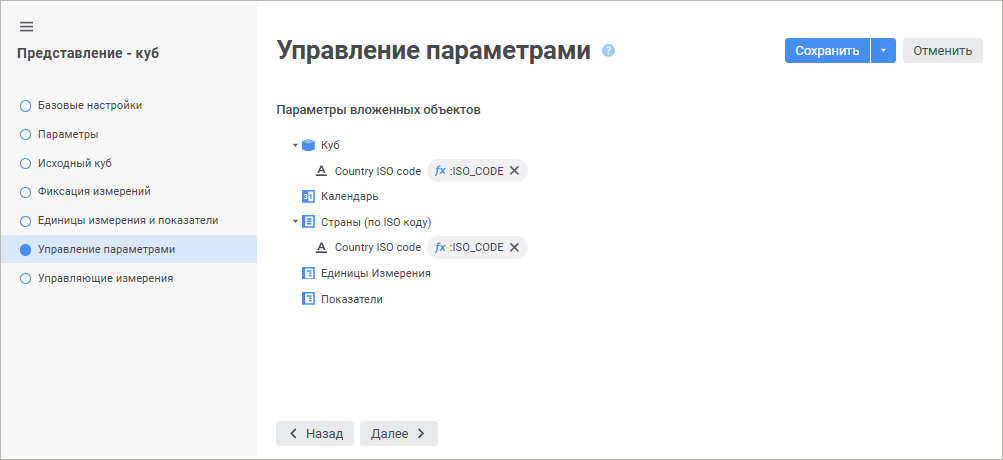 Примечание. Страница «Управление параметрами» доступна в мастере, если для куба созданы параметры на странице «Параметры».