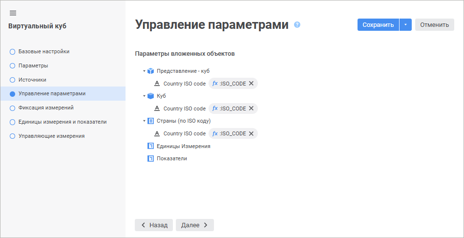 Примечание. Страница «Управление параметрами» доступна в мастере, если для куба созданы параметры на странице «Параметры».