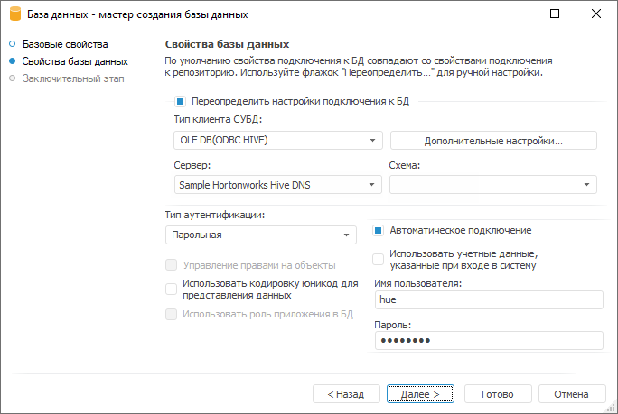 В свойствах базы данных укажите тип клиента СУБД «OLE DB(ODBC HIVE)».