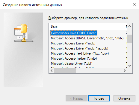 В открывшемся окне «Создание нового источника данных» выберите «Hortonworks Hive ODBC Driver»: