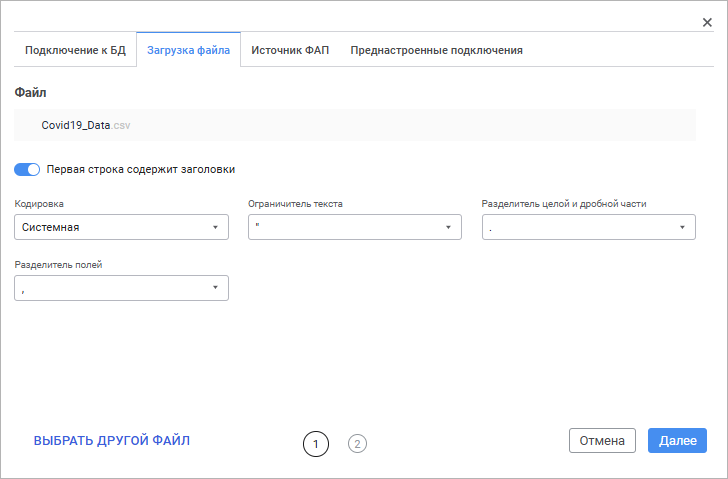 В результате на вкладке отобразится мастер загрузки, вид которого зависит от формата файла: