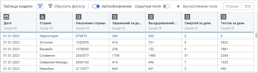 Для настройки автообновления таблицы предварительного просмотра используйте переключатель «Автообновление». По умолчанию переключатель активен и данные в таблице обновляются при каждом изменении в модели данных.