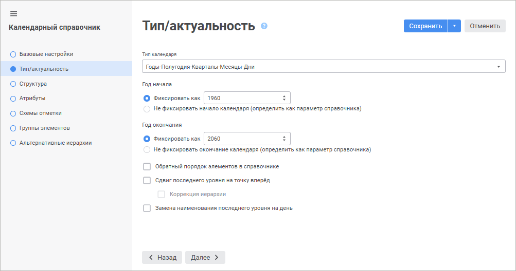 Календарный справочник поддерживает динамическое определение начала и окончания временной шкалы, то есть является динамическим.