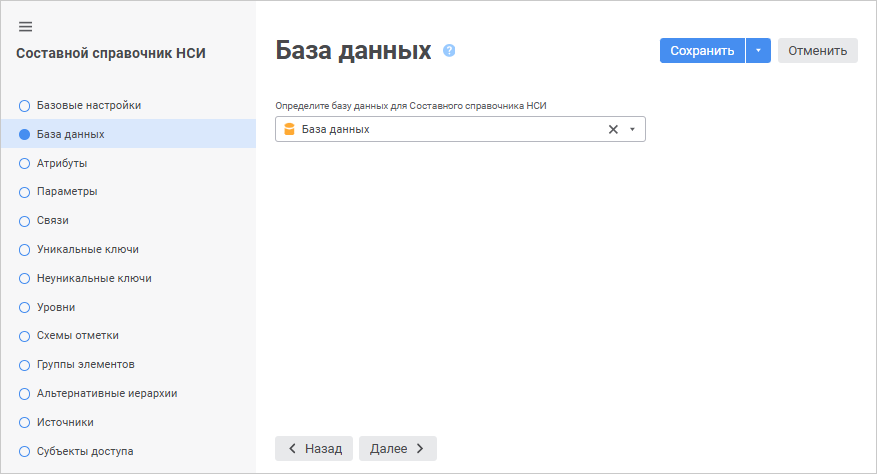 На странице «База данных» в веб-приложении и «Настройки» в настольном приложении выбирается база данных для хранения данных составного справочника НСИ.