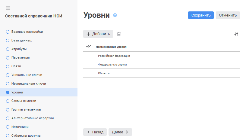 В веб-приложении для перехода на вкладки мастера «Схемы отметки», «Группы элементов», «Альтернативные иерархии» сохраните настройки справочника, для этого нажмите кнопку «Сохранить».