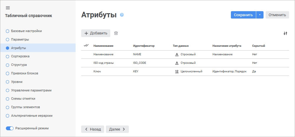 На странице «Атрибуты» задаётся список атрибутов справочника и их назначение. Список атрибутов определяет набор характеристик, которые будет иметь каждый элемент справочника.