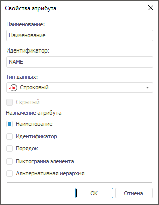 Наименование. Атрибут, значение которого будет отображаться в качестве наименования элемента при открытии справочника. Один атрибут должен обязательно иметь назначение «Наименование». При выполнении агрегации данных атрибут должен быть с единственным назначением «Наименование» в списке атрибутов;