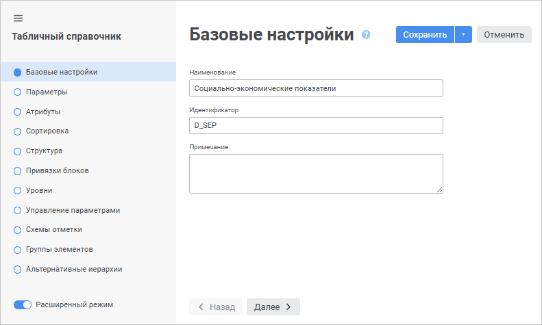 На странице «Базовые свойства» задайте стандартные параметры справочника: