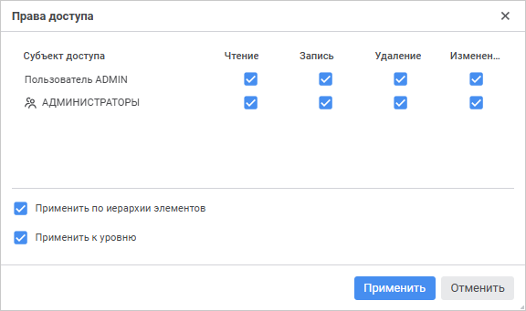 Применить к уровню. Установка флажка позволяет применять права доступа к элементам всего уровня, к которому принадлежит настраиваемый элемент.