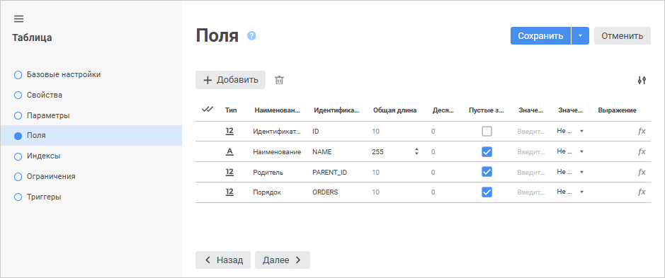| Наименование | NAME | Строковый | 255 | Допускаются |