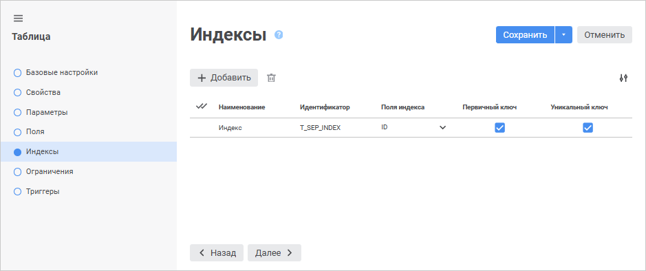 В раскрывающемся списке «Поля индекса» выберите поле «ID», затем установите флажок «Первичный ключ». Страница «Индексы» примет вид: