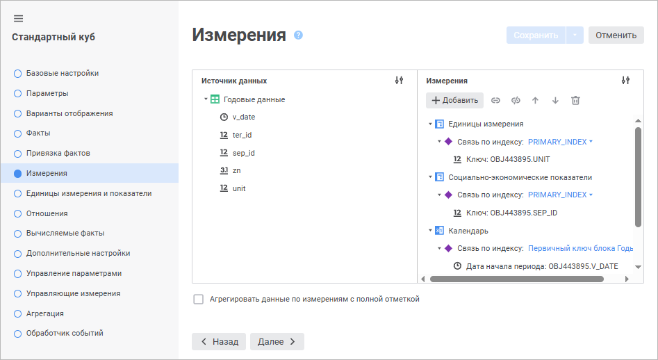 Созданные справочники должны быть добавлены в список измерений куба на страницу «Измерения» и выбраны на странице «Единицы измерения и показатели». Справочники могут быть как обычными, так и справочниками НСИ.