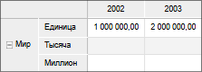 Пример куба до включения пересчета единиц измерения, справочник единиц измерения выведен в строки:
