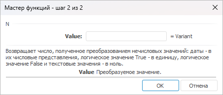 Возвращает число, полученное преобразованием нечисловых значений: даты - в их числовые представления, логическое значение True - в единицу, логическое значение False и текстовые значения - в ноль.