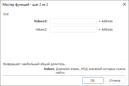 Values1, Values2, …, ValuesN. Диапазон ячеек, наибольший общий делитель которых нужно найти.