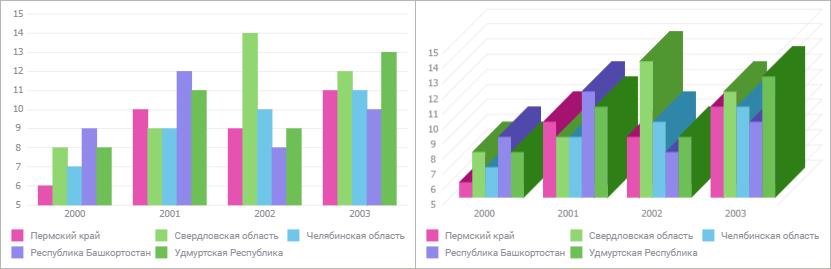 Пример отображения гистограммы с абсолютными значениями и такой же трехмерной: