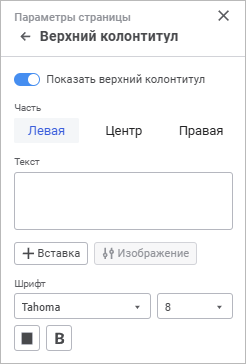 Показать верхний/нижний колонтитул. По умолчанию переключатель переведён в активное состояние. Доступна настройка верхнего/нижнего колонтитула и его отображение на листах отчёта;
