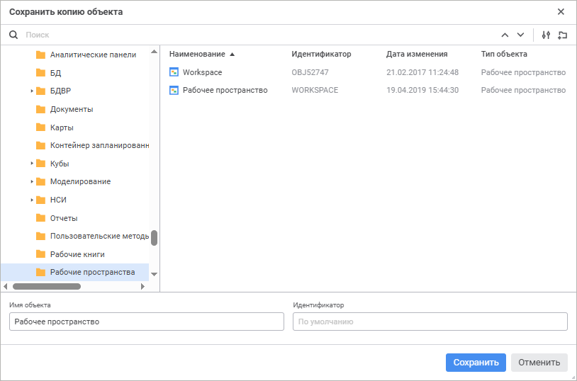 При создании копии рабочего пространства в репозитории создаётся новое рабочее пространство, которое сразу же открывается на редактирование. Если объект с идентификатором, указанным в окне «Сохранить копию объекта», уже существует, то при попытке создания копии рабочего пространства: